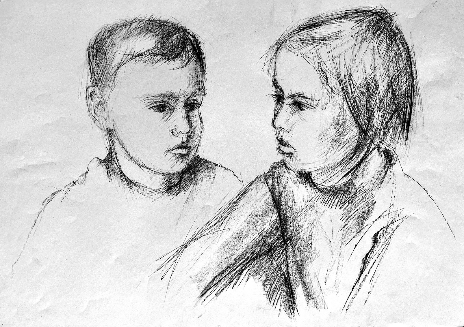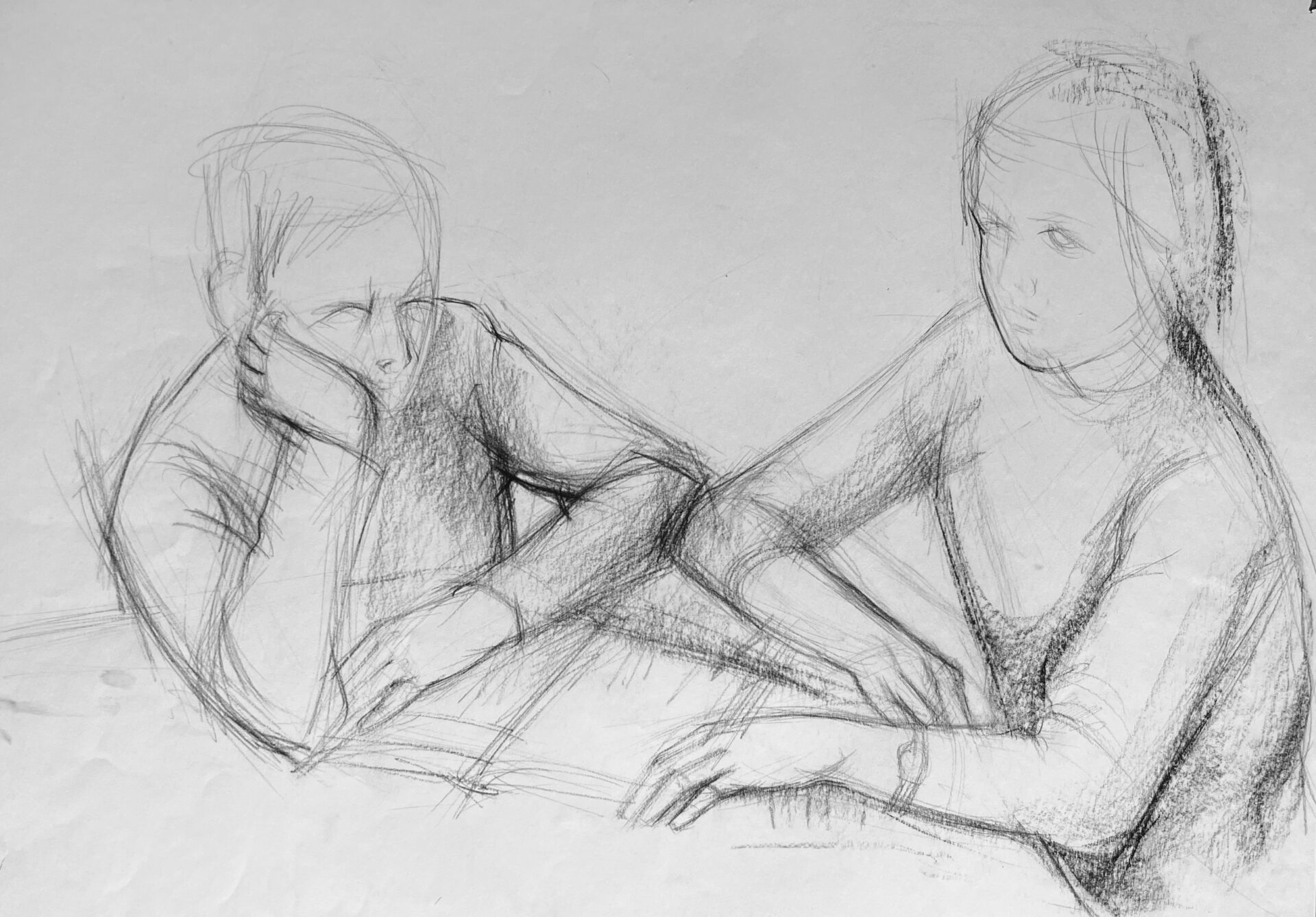 Junge und Mädchen am Tisch ohne Entstehungsjahr, um 1964, Kreide, schwarz,